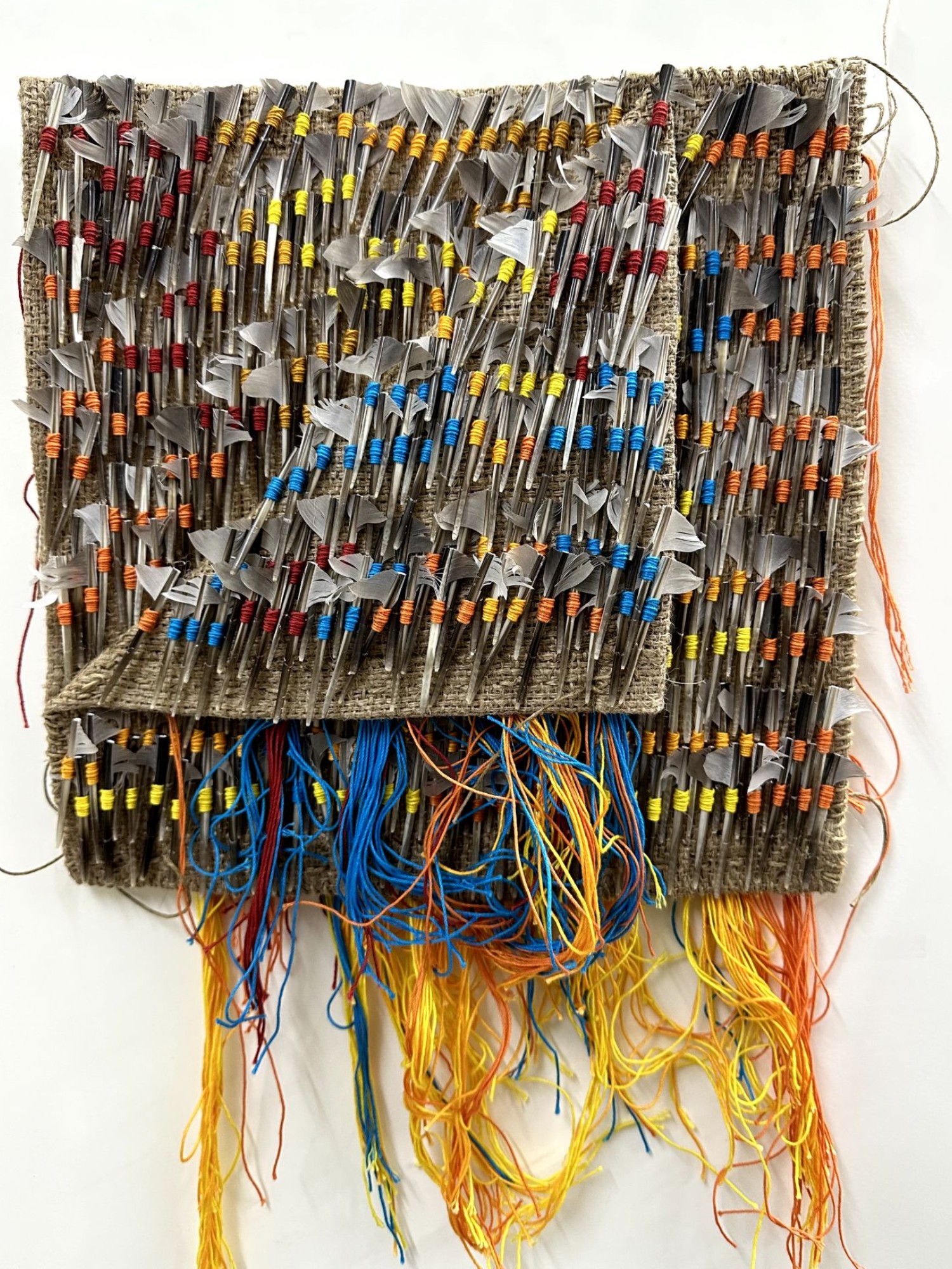 Initially the act of weaving began when Bajaj attempted to recycle the unused shafts left over from her feather sculptures; later she began to enjoy both the process and the outcome. During the disorienting time of the pandemic, she found deep solace in the meditative craft of knotting and stitching, something familiar and beloved to her that she saw as a legacy from her mother, who excelled in embroidery, knitting, crocheting and working deftly with her hands.